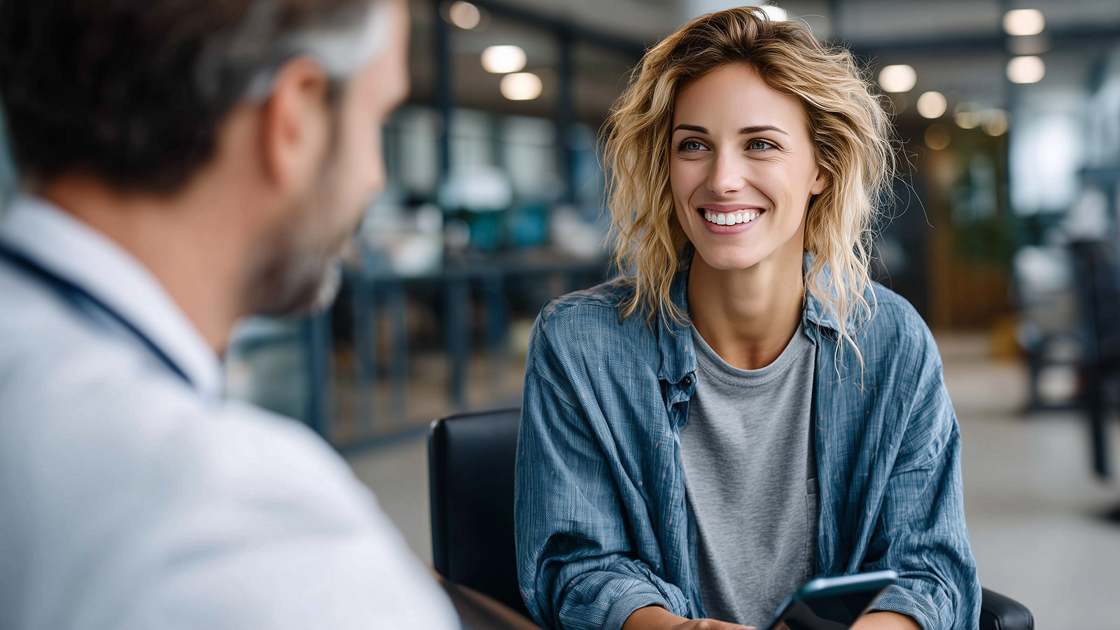 Das Smartphone liegt auf dem Schoß. Während der Arzt spricht, kann man wirklich zuhören.