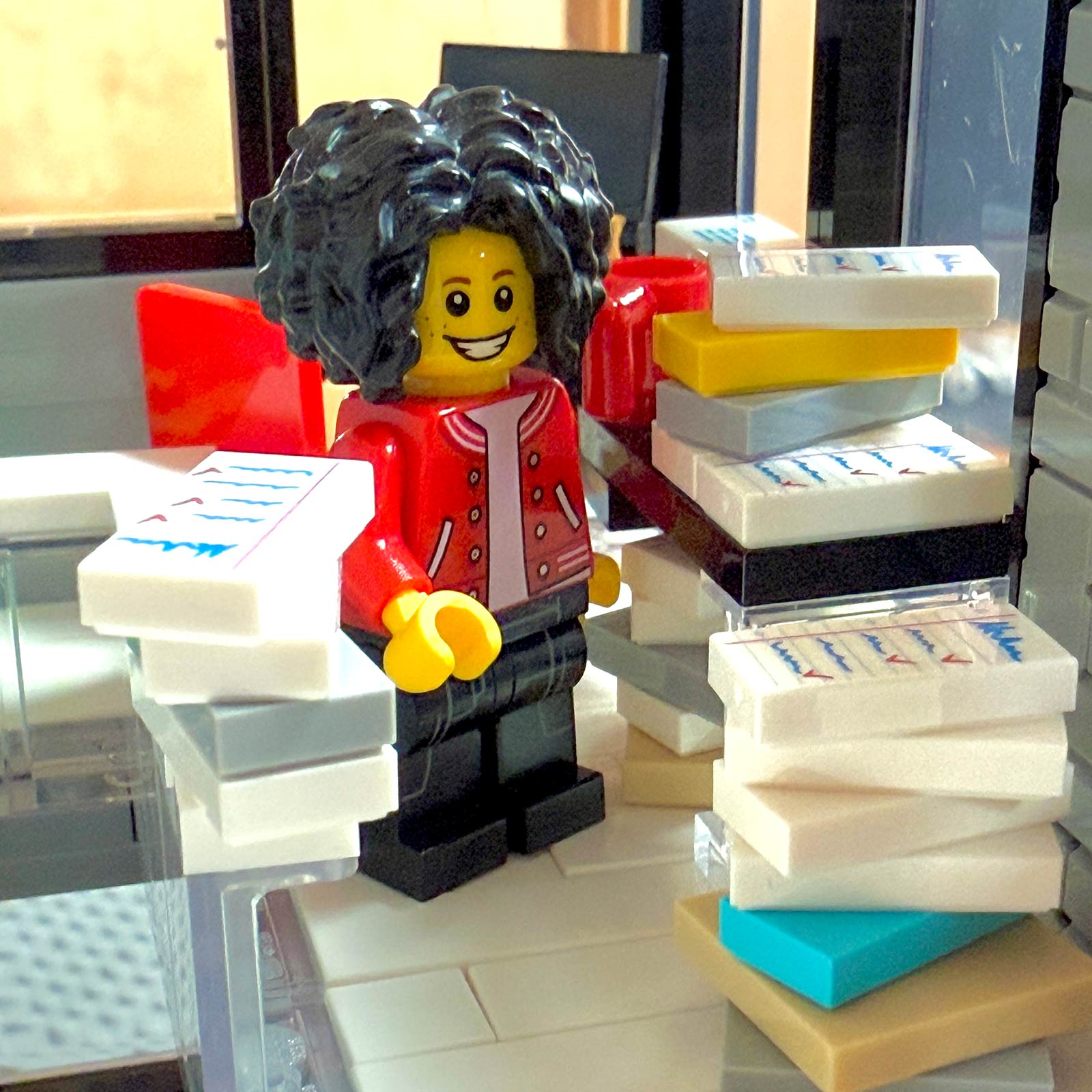 Hier neben mir in meinem Büro steht meine LEGO-Stadt. OK, ein Teil davon: Eine Häuserzeile, die ich Stein für Stein selbst entworfen habe: Eine Druckerei. Eine Litfaßsäulenfabrik. Eine Kunstschule. Ein Gemeinschaftshaus für Besprechungen und Austausch. Mein Headquarter. Eine Steinefabrik. Davor "tobt" das Minifiguren-Leben im Park.